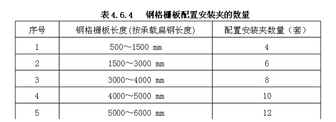 4.6.4 對(dui)於(yu)有(you)拆(chai)卸(xie)要(yao)求(qiu)的(de)鋼(gang)格(ge)柵(zha)板(ban)一(yi)般(ban)采(cai)用(yong)安(an)裝(zhuang)夾(jia)安(an)裝(zhuang)。按(an)照(zhao)圖(tu)紙(zhi)或(huo)廠(chang)家(jia)技(ji)術(shu)文(wen)件(jian)要(yao)求(qiu),將(jiang)鋼(gang)格(ge)柵(zha)板(ban)用(yong)安(an)裝(zhuang)夾(jia)緊(jin)固(gu)在(zai)支(zhi)承(cheng)粱(liang)上(shang),原(yuan)則(ze)上(shang)每(mei)塊(kuai)鋼(gang)格(ge)柵(zha)板(ban)的(de)安(an)裝(zhuang)(約1平方米計)不少於四套安裝夾,分別安裝在鋼格柵板的四個角上。但如果鋼格柵板較長,且板中間有支承梁的情況下,安裝夾可按表4.6.4鋼格柵板配置安裝夾的數量配置