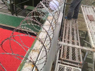 (5)安裝好支架立柱了,先把要安裝刀片刺繩的拉絲給固定上,然後利用拉絲的支撐力來安裝刀片刺繩,並用專用的卡扣、卡鉗進行固定。