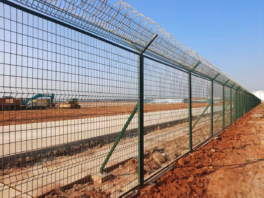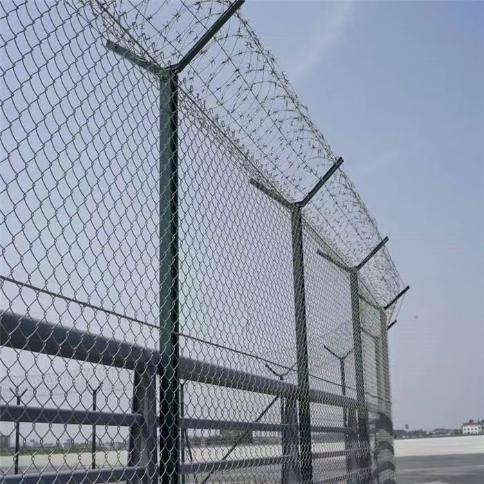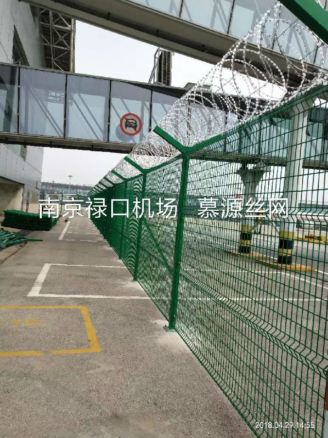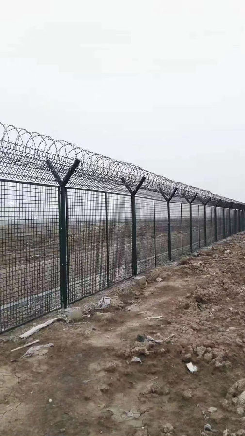 機場鋼筋網圍界是用於機場周邊防護,防止人和動物私自進入,它是由立柱、網片、刀刺滾籠等組成,表麵處理一般為浸塑或噴塑,來延長使用壽命。